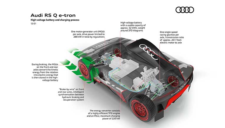 The RS Q e-tron recovers energy during braking. The MGU units on the front and