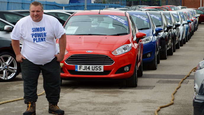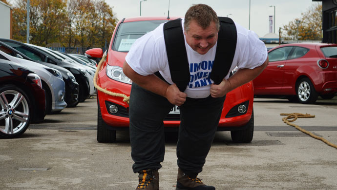 In England’s Derby area, strongman Simon Plant pulled Ford Fiesta cars, with a combined weight of almost 16 tonnes, over a distance of 18 feet and six inches on his third attempt. In the process he smashed the World Record for pulling chained-together cars. The cars belonged to Motorpoint, UK’s leading car supermarket. It joined forces with the 42 year-old builder in his bid to pull 14 cars over a distance of 15 feet at the company’s headquarters in Derby in aid of Macmillan Cancer Support.